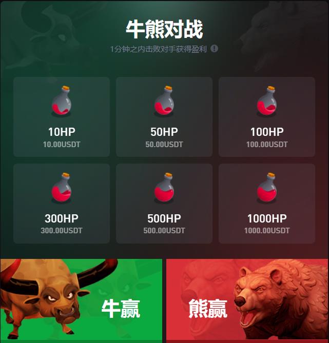 衡量牛方和熊方谁胜谁负的因素则是“HP”的判定,双方的初始HP等于下单金额,假设牛熊双方分别下注100USDT,即各自都会有1000HP。(备注USDT与HP的比例为1:1,即1USDT等于1HP。)